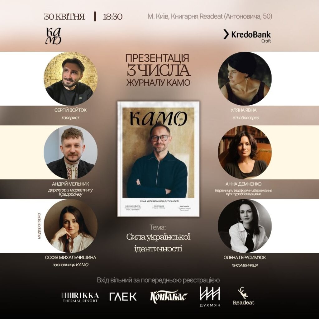 KAMO – медіа про сучасну українську культуру, де ми досліджуємо і вшановуємо український лайфстайл у всіх його проявах — від традицій до сучасності, від речей і простору до людей і їхніх історій. Наш журнал — це не просто медіа, це майданчик для тих, хто творить, дбає, зберігає і шукає нову естетику в національному контексті. Наша мета — бути головним референсом українського лайфстайлу: натхненням для тих, хто формує нову візуальність і сенсовність щоденного життя в Україні.