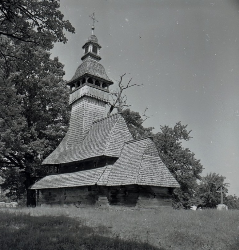 Дерев’яний храм збудовано в 1824 р. і є головною складовою ансамблю, що підкреслюється розміщенням на кращій для огляду мисоподібній ділянці.