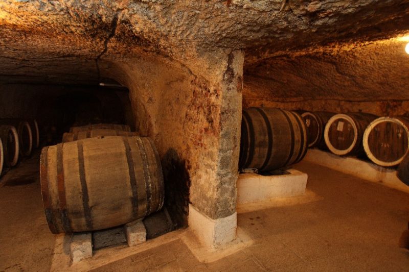 Підвали були закладені 1557 року Франциском Стефаном і Домініком Добо, про що свідчить кам’яна табличка біля старого входу в підземелля. Будівництво підвалів велося силами полонених турків. Їх загальна довжина склала 4,5 км. Спочатку підвали грали роль підземного притулку при нападі ворогів, однак поступово перетворилися на виносховище. Тунелі висічені в туфі — пористій породі вулканічного походження. У середині постійна температура 12 оС, що є ідеальними умовами для витримки вина”.