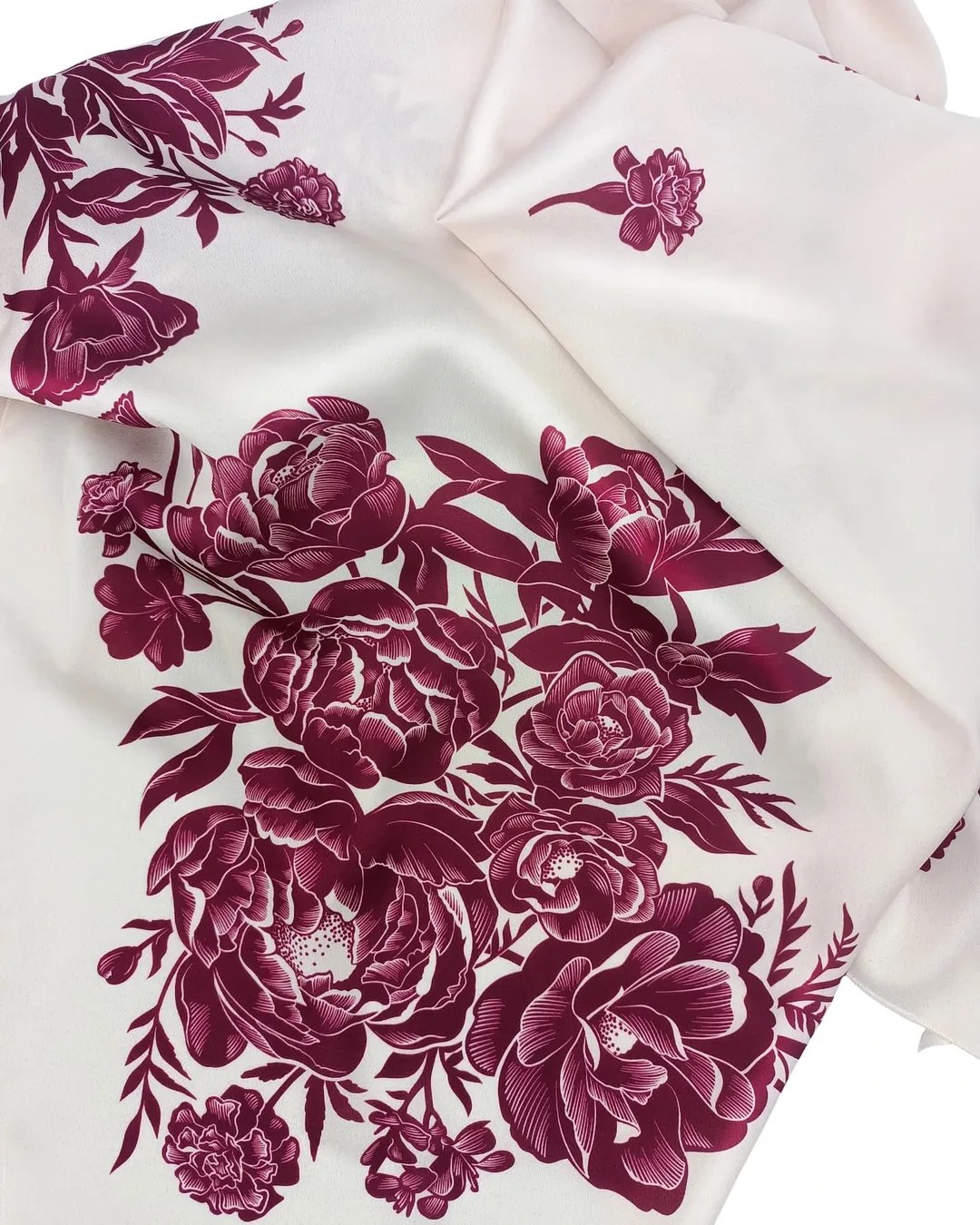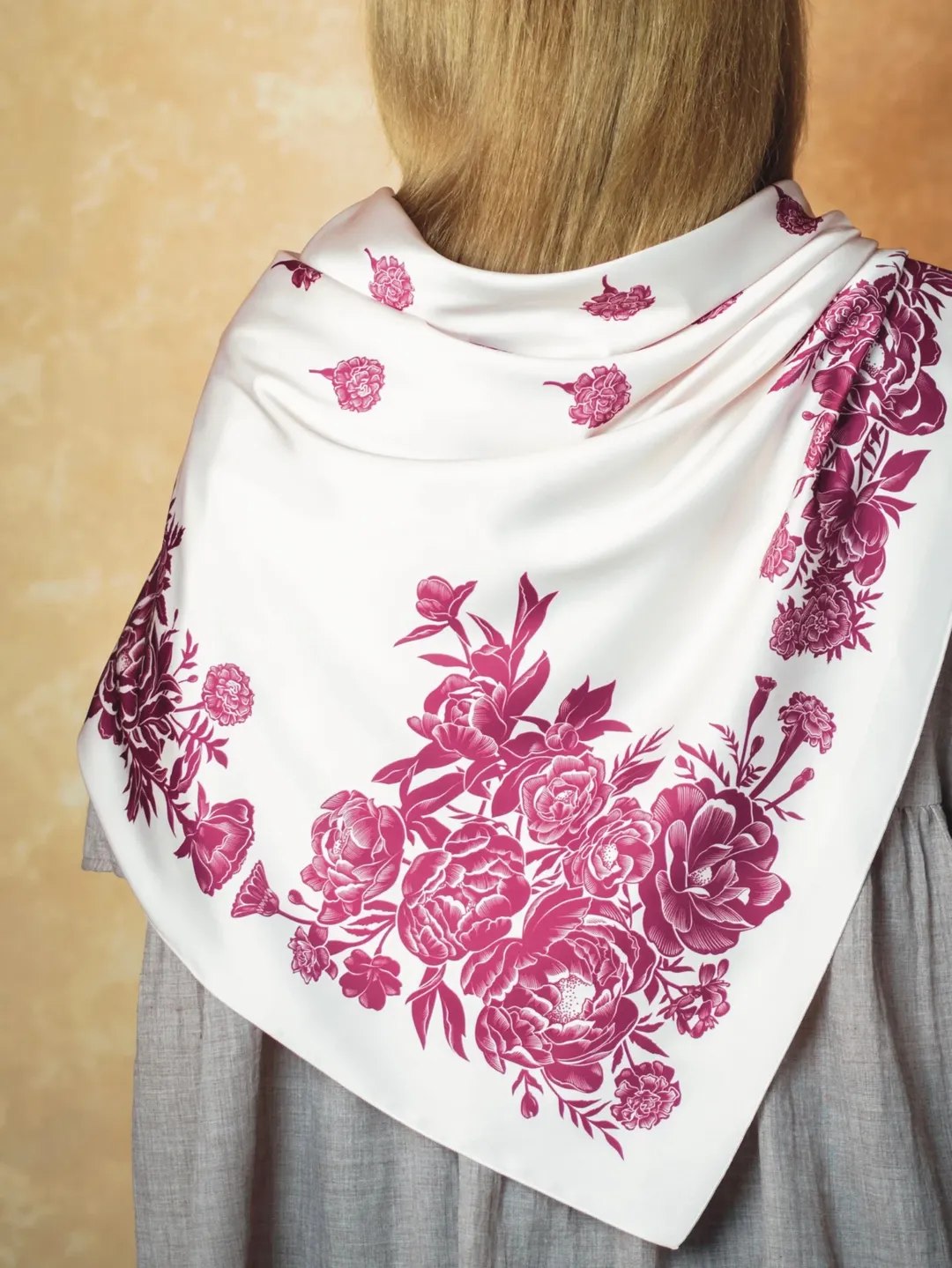 Гадаю, це гармонійний діалог між минулим і прийдешнім. Сучасна ефектна тканина зі стриманими монохромними принтами виглядає модерно й стильно. Проте враження хустка справляє глибоко традиційне. Це відбувається завдяки знайомій нам із дитинства графічній мові орнаменту, що відгукується десь на рівні генетичної пам’яті.
