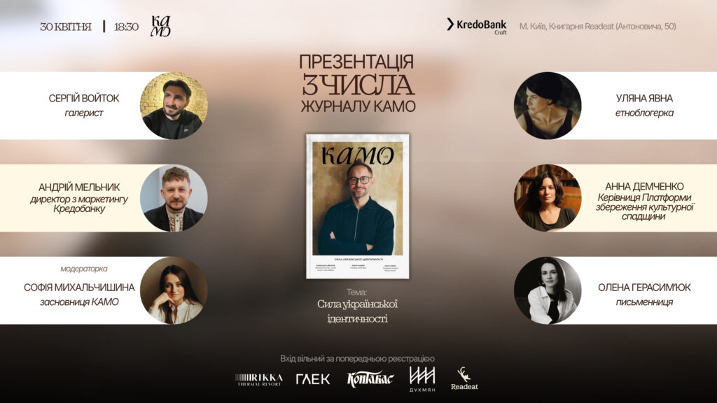 Презентація об’єднає читачів, культурних діячів і представників креативних індустрій навколо теми української ідентичності. Гості події одними з перших побачать новий випуск журналу КАМО та почують про процес його створення — із закулісними історіями й деталями.