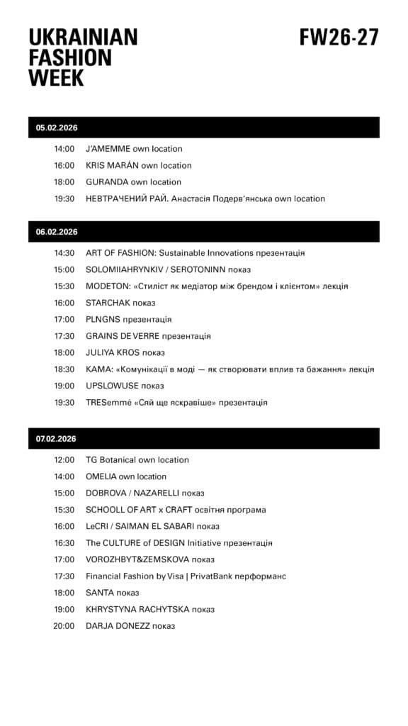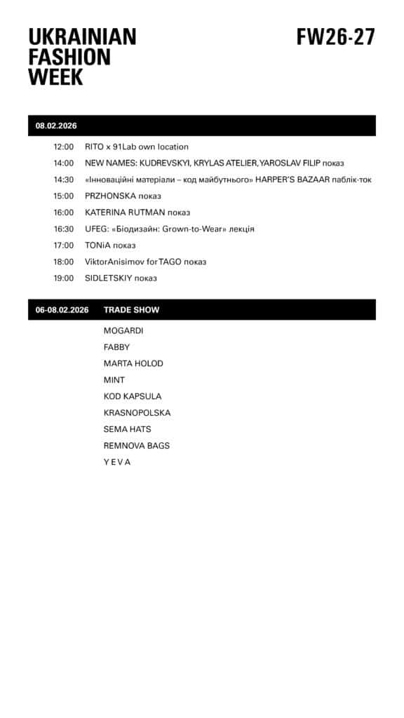 Ukrainian Fashion Week FW26-27 об’єднає дизайнерів, які беруть участь у Тижні моди з першого сезону 1997 року, та бренди, що дебютували у вересні в межах програми New Names і були фіналістами конкурсу «Погляд у майбутнє». Таким чином Ukrainian Fashion Week демонструє сталість і тяглість професійної спільноти та продовжує виконувати роль інституції, яка представляє українську fashion-індустрію в Україні та світі, розвиває екосистему й посилює культурну дипломатію.