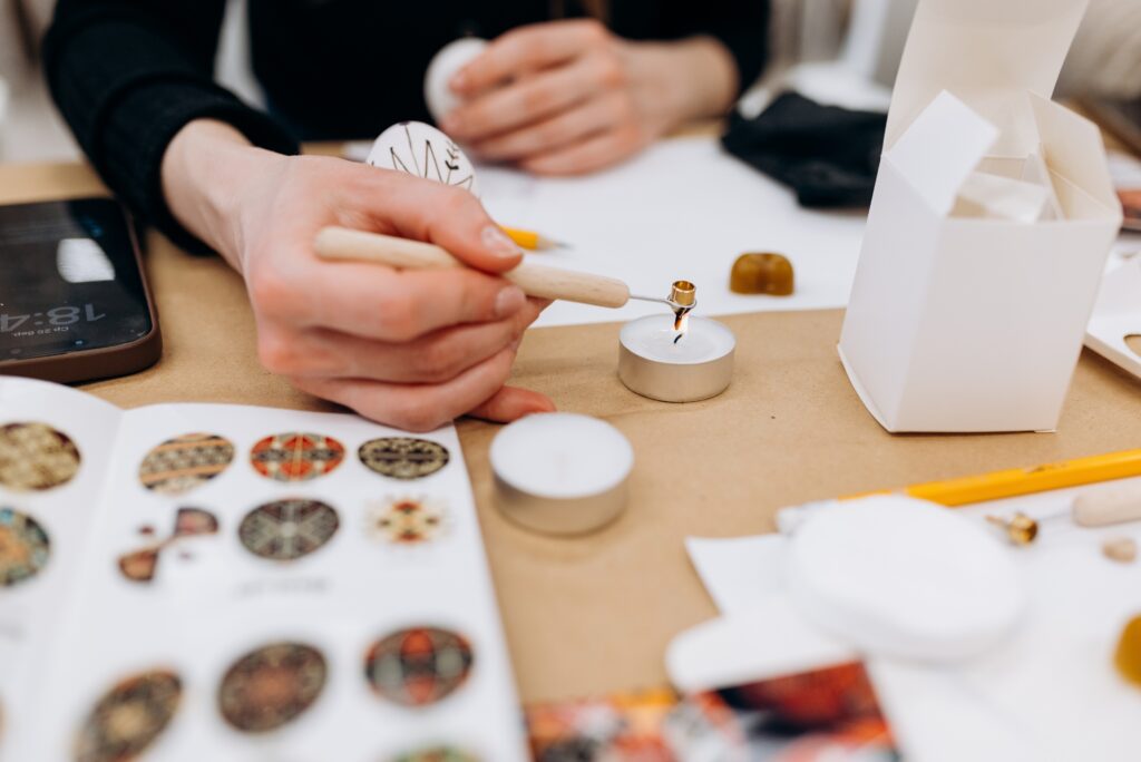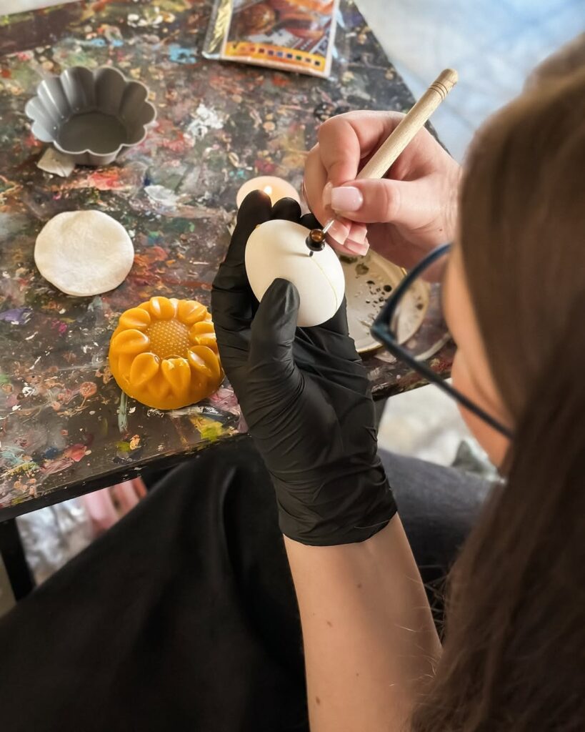 Обов’язково потрібен саме бджолиний віск, бо він щільно вбирається в поверхню і захищає колір. Звичайним парафіном писати неможливо, він не дасть потрібного результату. Ну і, звісно, свічка, над якою ми розігріваємо писачок. Це зовсім не складно.