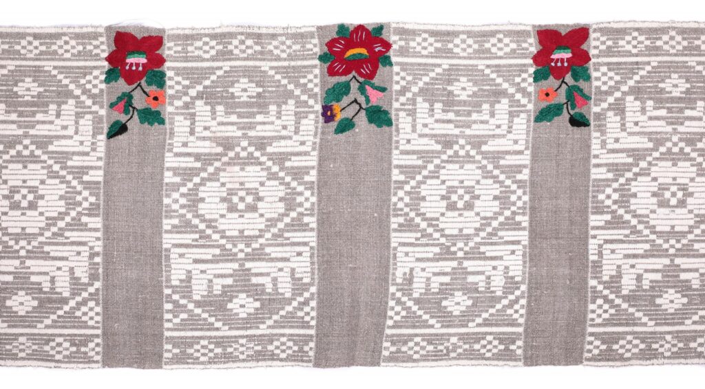 Наступна група рушників на виставці походить з іншої частини Полісся — півночі Волинської області, зокрема Любешівського району. На відміну від Житомирщини чи Київщини, де домінує червоний колір, тут переважають сіробілі тканини. Важливо зазначити, що цей термін не народного походження: він виник у професійному середовищі мануфактур і фабрик для позначення відповідної техніки ткацтва. Візерунок утворюється завдяки поєднанню сірої та білої нитки. Сіра нитка — це невибілений льон або конопля, біла — вибілений льон чи коноплі, або ж біла вовняна пряжа. Ці рушники походять із різних регіонів: Черкащини, Житомирщини, Київщини. Тобто цей тип рушників був відомий по всій Україні.