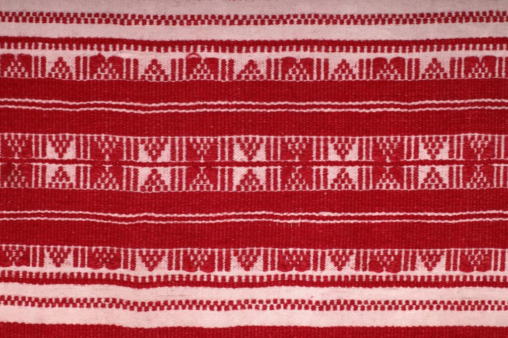 На житомирських рушниках у підписах можна побачити ще одну назву — «ткацтво у вічку». Якщо придивитися, коли на рушнику поєднуються два кольори (наприклад, червоний і білий), між ними помітна маленька «дірочка». Це місце, де нитки двох кольорів розвертаються на сусідніх нитках, утворюючи характерний мікропростір — «вічко». Отже, ці назви «в сосанку», «в кружку», «у вічку» — це позначення саме технік ткацтва, а не окремих орнаментів.