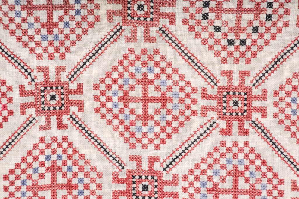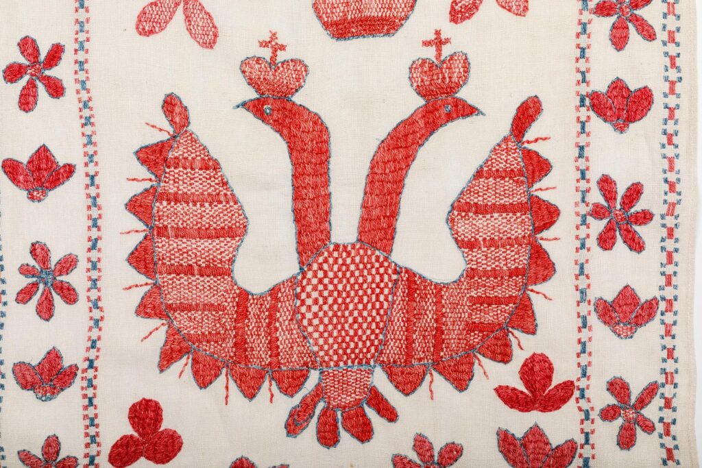 Тут був особливо модний синій. Серед цих рушників — композиції, що близькі до кролевецьких, але не повторюють їх повністю. У Чернігівщини був свій стиль: ширші полотна, складніші орнаменти, менше «соціальних ліній». Тут і трійцісвічники, і берегині, і двоголові орли — ті самі, що ми вже бачили раніше. У ХІХ столітті вже існували фабричні барвники. Але ж до того фарбували природними: коренем марени або кошеніллю. Це той самий маленький червоний жучок, який збирали в червні — і від нього, кажуть, і назва місяця пішла. В середньовічній Європі цей барвник був дорожчим за золото. У наших літописах записано: податок із селян брали мареною або двома ложками кошенілі. Лише якщо люди не могли здати фарбник, їм дозволяли сплатити гроші.