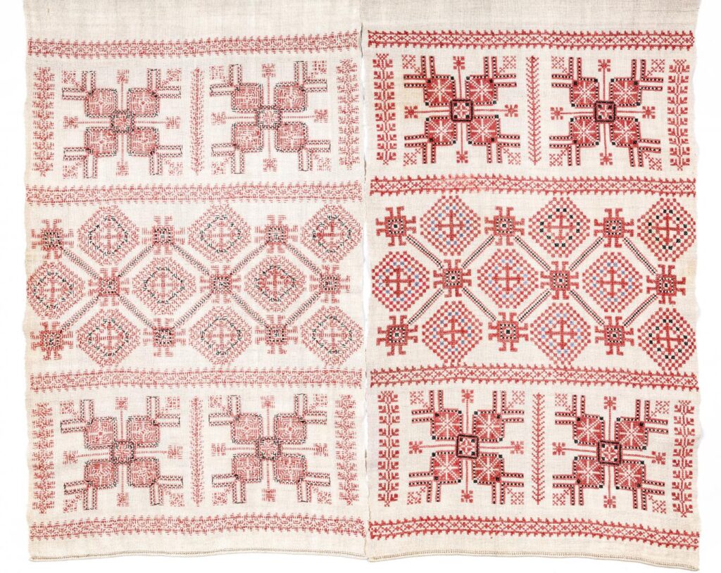 Далі представлений цікавий тип рушників, у яких червоний і білий кольори міняються місцями: основний фон — червоний, а візерунок — білий. У цьому немає особливого символізму — це художній експеримент, спосіб урізноманітнити вигляд тканих рушників. Таких зразків було чимало, їх виготовляли активно. Під впливом цього типу з’явилися й вишиті рушники на червоному тлі, оздоблені білою або кольоровою ниткою — це теж частина традиції. На іншому рушнику бачимо, як образ берегині поступово трансформується, зокрема у зображення церкви. Це не конкретна будівля, а символічний образ, пов’язаний із тим, що кролевецькі рушники часто використовувалися у церковному та архієрейському побуті.