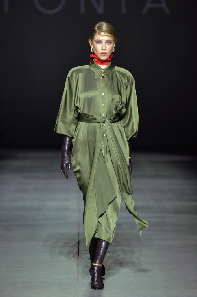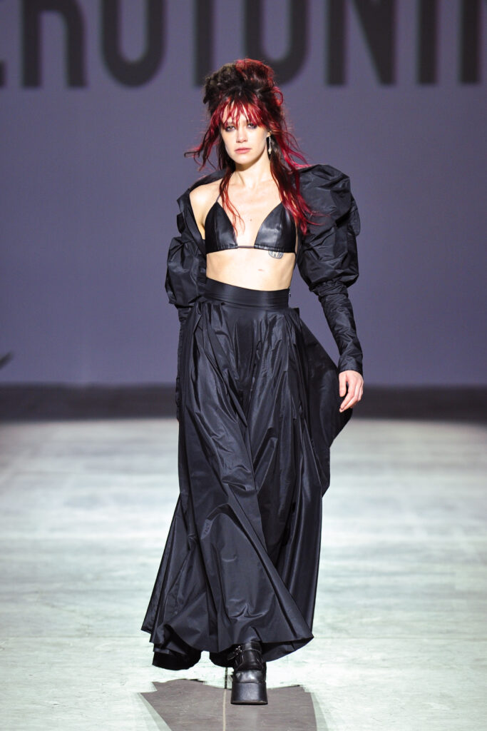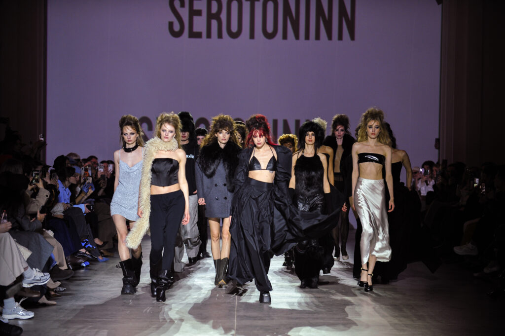 Об’ємні шуби зі штучного хутра, оксамитові корсети, напівпрозорі міні сукні з делікатним блиском і латексні силуети – це все описує їхній концепт. Колекція бренду SEROTONINN стала роздумом про життя між двома країнами та пошук власного місця у новому середовищі. Дизайнерка Лена Шнелле, яка вже багато років живе у Німеччині, присвятила сезон FW26/27 досвіду інтеграції та збереження ідентичності. Відкрила подіум співачка та учасниця шоу «Топ-модель по-українськи» Саша Кугат.