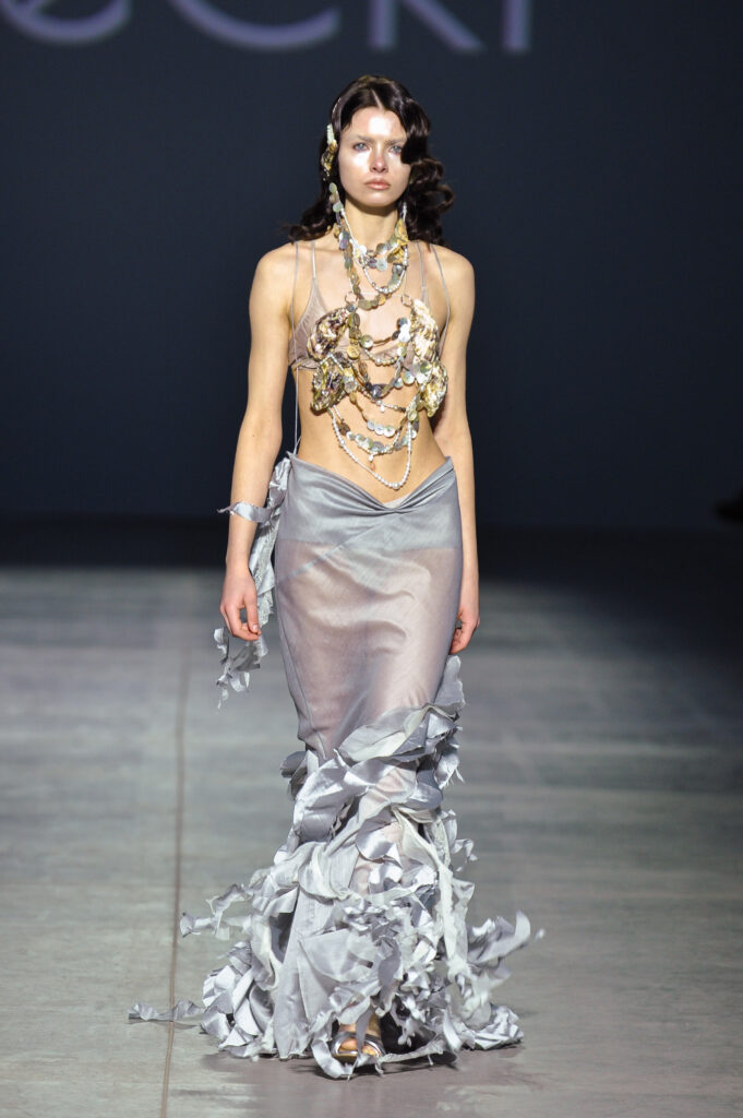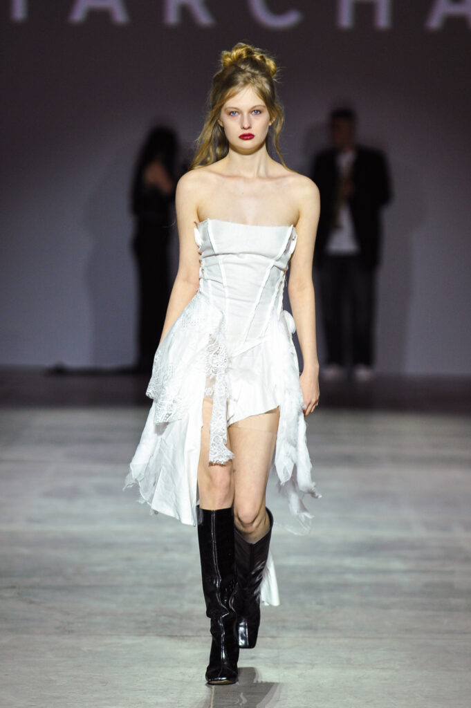 Особливу атмосферу створила постановка показу: моделі рухалися не лише подіумом, а й серед глядачів, змінюючи траєкторії та напрямки руху. Це створювало відчуття постійної напруги, адже глядач не знав, де саме з’явиться наступний образ. Моторошний, майже інтуїтивний музичний супровід лише підсилював відчуття занурення у світ між реальністю та міфом.